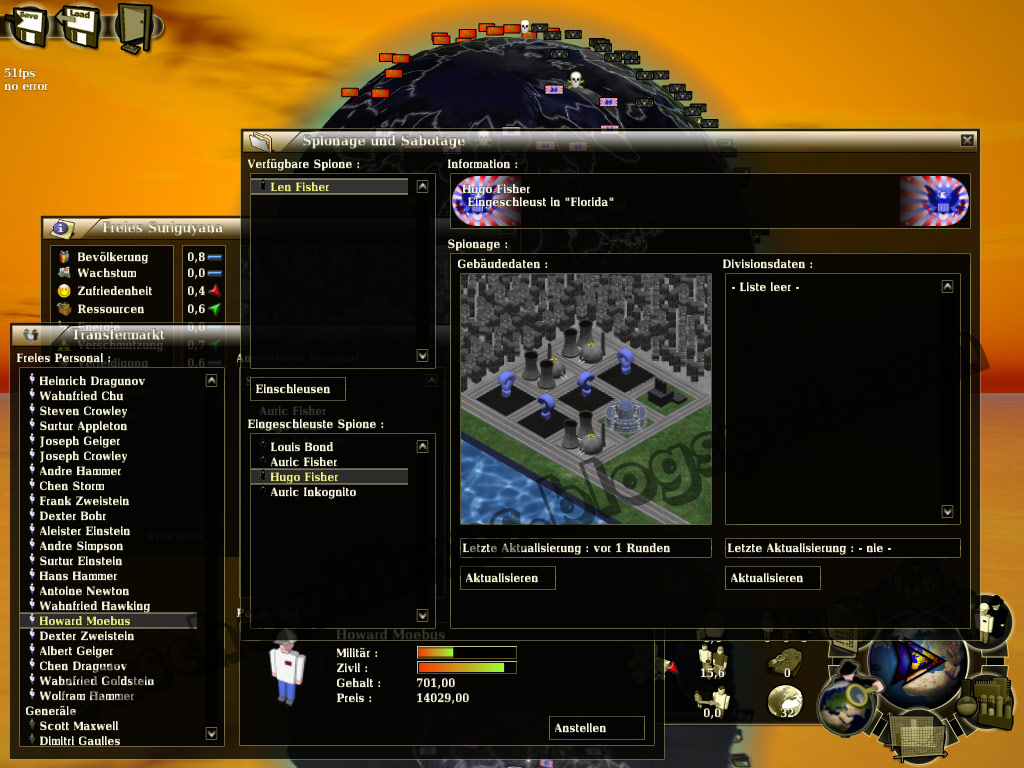 The feature works as follows : Like with scientists you can also hire spies, each one with it’s own stats (the better the stats, the more expensive he is). In the espioange and sabotage window newly added you can now try to infiltrate an enemy region with free spies from your staff, which either will end up with him being captured (and being lost for you, including the money you paid to hire him) or successfully infiltrating that region. From now on then you have one action per spy in each round. As for espionage you can try to request information on either the buildings or a division stationed in that region, with (as above) the risk of the spy being captured. The outcome also depends on the skills of the spy, so a cheap but lousy spy will maybe uncover 2 or even less buildings per action, where a really good spy can retrieve almost all buildings in one try. The information then is stored and you can always take a look at it again, though it get’s outdated. The age of the information last retrieved is also shown, so you can quickly see when you have to update those infos.