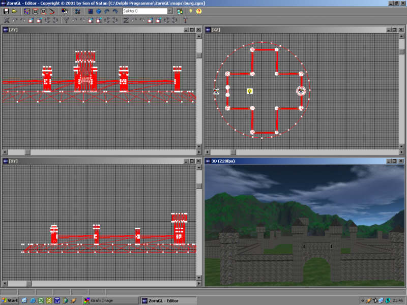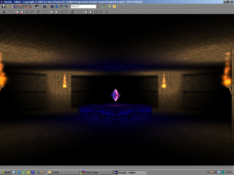 After finishing this for school, I additionally worked on it several months to make it into an engine for a RPG. But as the engine was one of my first OpenGL apps, it had many problems that had gotten even worse in the end so I decided to totally stop that project. It was developed in Delphi 6 used OpenGL for the graphics and a self-written network code (TCP/IP) for multiplayer. It also came with an own mapeditor that later on also had a partly-working lightmapper included.